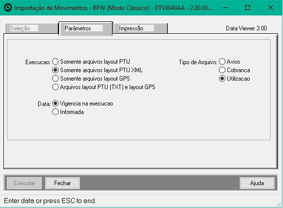 - Incluída a opção de seleção do PTU Utilização no campo Tipo de Arquivo quando selecionada a opção de execução Somente arquivos layout PTU XML.