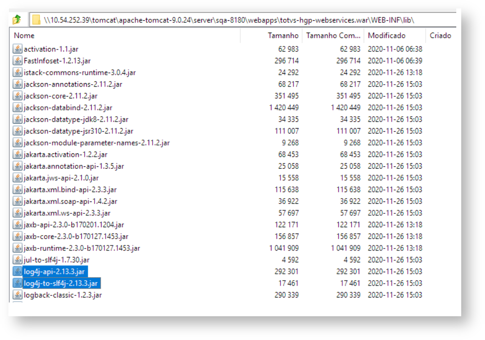Identificado vulnerabilidade para quem utiliza apache Tomcat. Em uma das lib's utilizadas pelo .war totvs-hgp-webservices existe a lib log4j versão 2.13.x o qual possui vulnerabilidades. Como contorno para segurança existem dois procedimentos para serem adotados conforme situação.