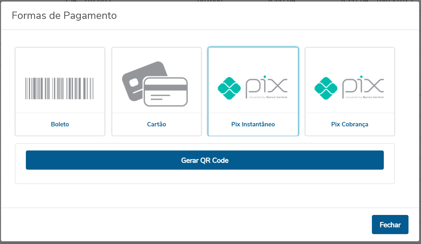 | Formas de Pagamento | Permite ao usuário selecionar uma forma de pagamento da fatura em questão, as opções de pagamento são: