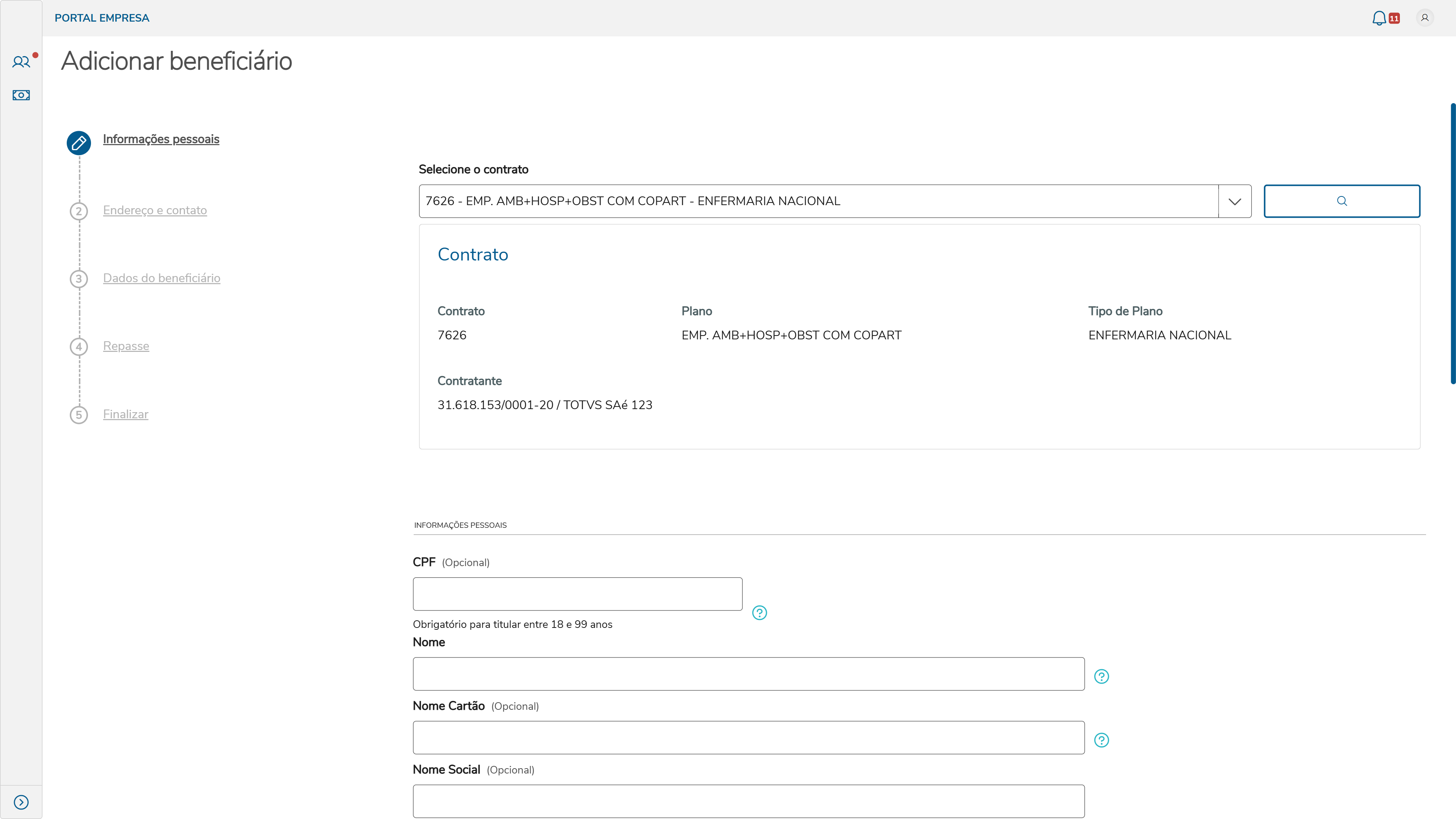 | Incluir Titular\Dependente | Inclusão/alteração de um beneficiário titular ou dependente. A inclusão de um novo beneficiário inicia a partir do botão de incluir titular ou dependente. O sistema irá carregar, então, os contratos que o usuário possui acesso, conforme parametrizado nos programas Manutenção Liberação Acesso e Manutenção Liberação Contratantes: Após selecionar o contrato, são abertos campos na tela para informar os dados do beneficiário. Essa tela é uma simplificação do acesso interno, possuindo os dados de pessoa física e beneficiário como um único formulário. Como os campos são os mesmos, esse documento irá definir as diferenças e as regras específicas aplicadas ao Portal Empresa.