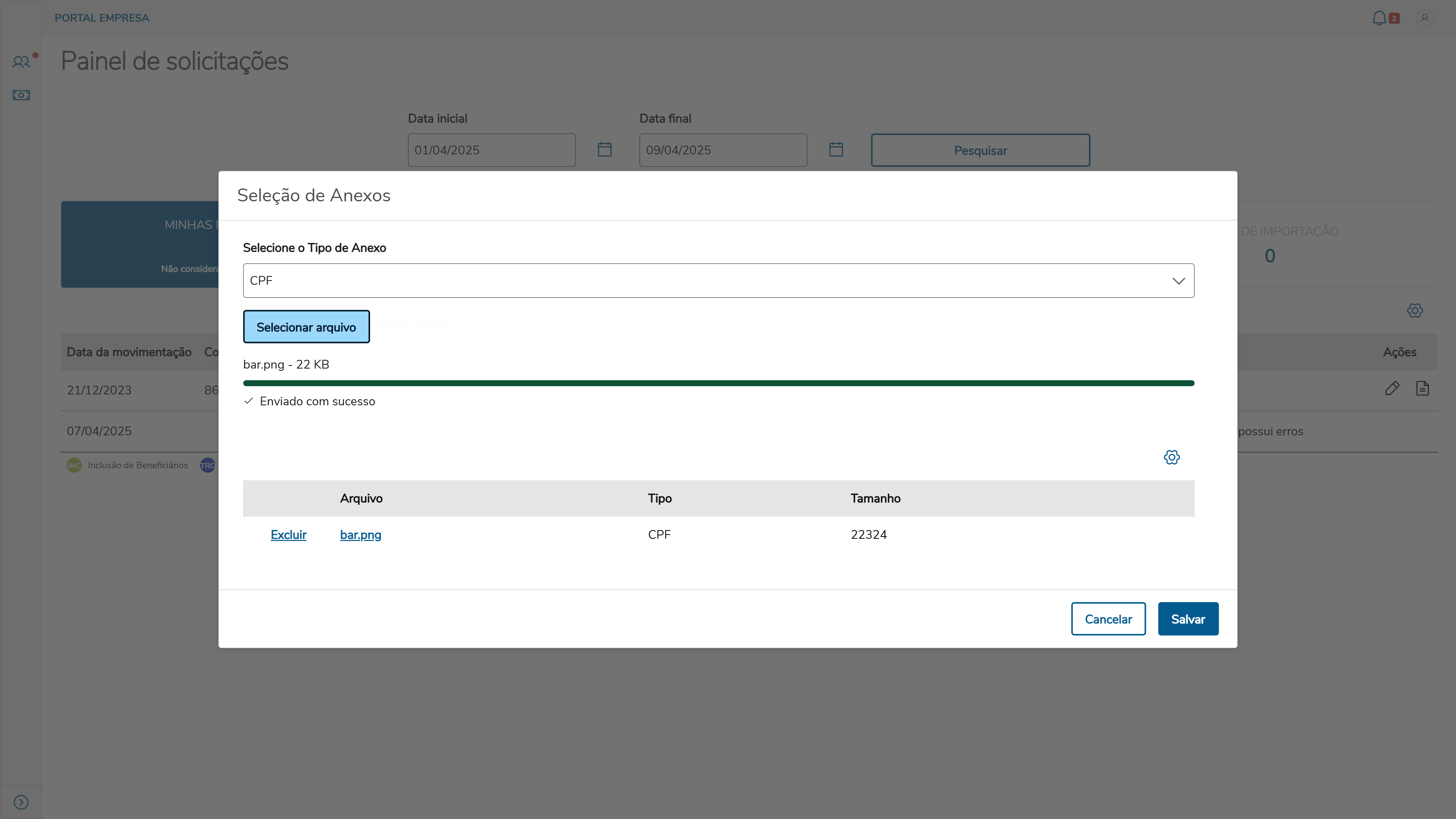 Através do ícone (Anexos), é possível acessar a tela de seleção de anexos, contendo os arquivos já anexados, e permitindo incluir e excluir arquivos referentes ao beneficiário.