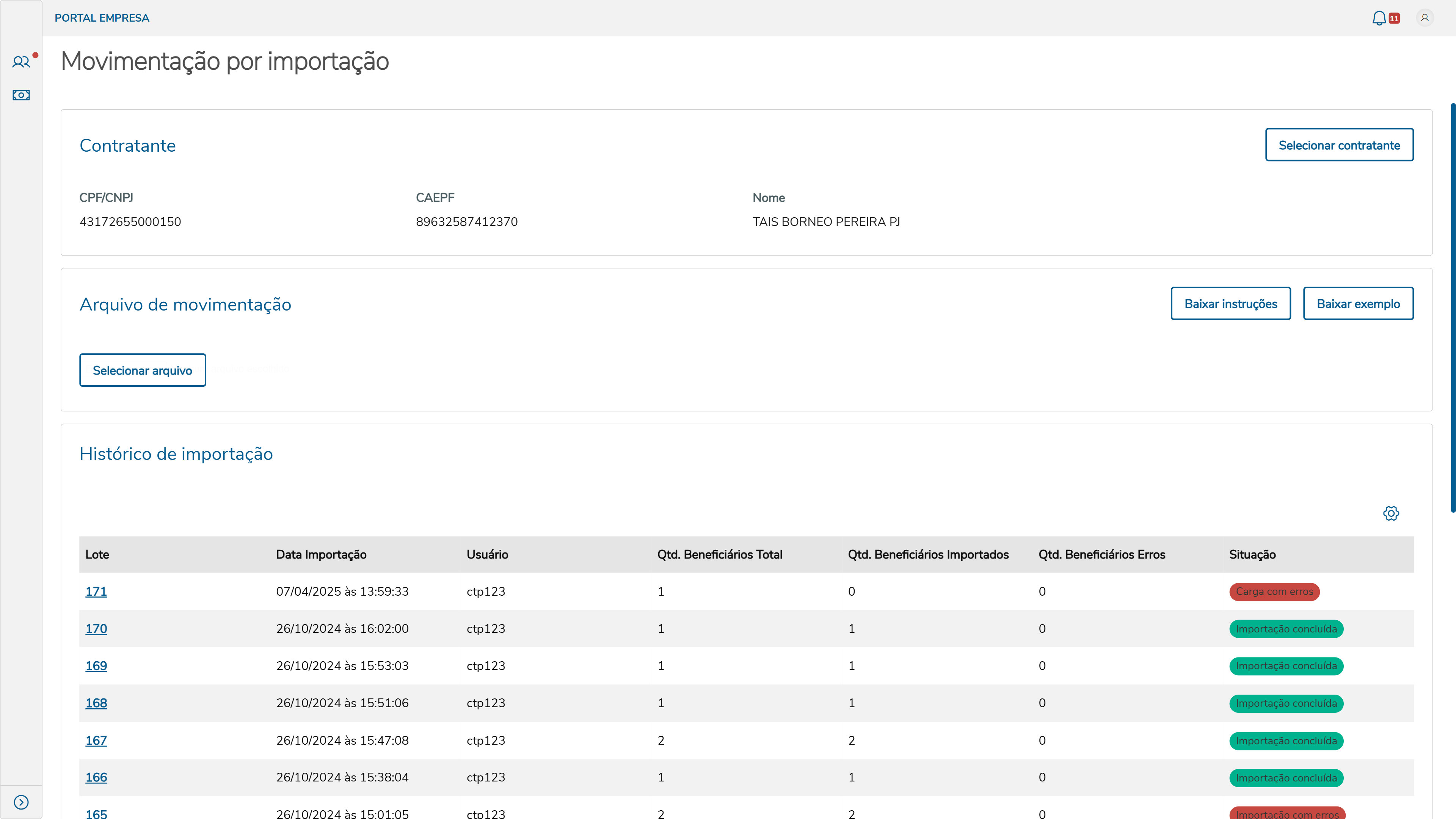 Quando o contratante possuir permissão para Importação CSV será apresentado um card contendo os Lotes de Importação. E caso tenha ocorrido erro no último lote importado será gerado um aviso contendo link para acesso ao lote.