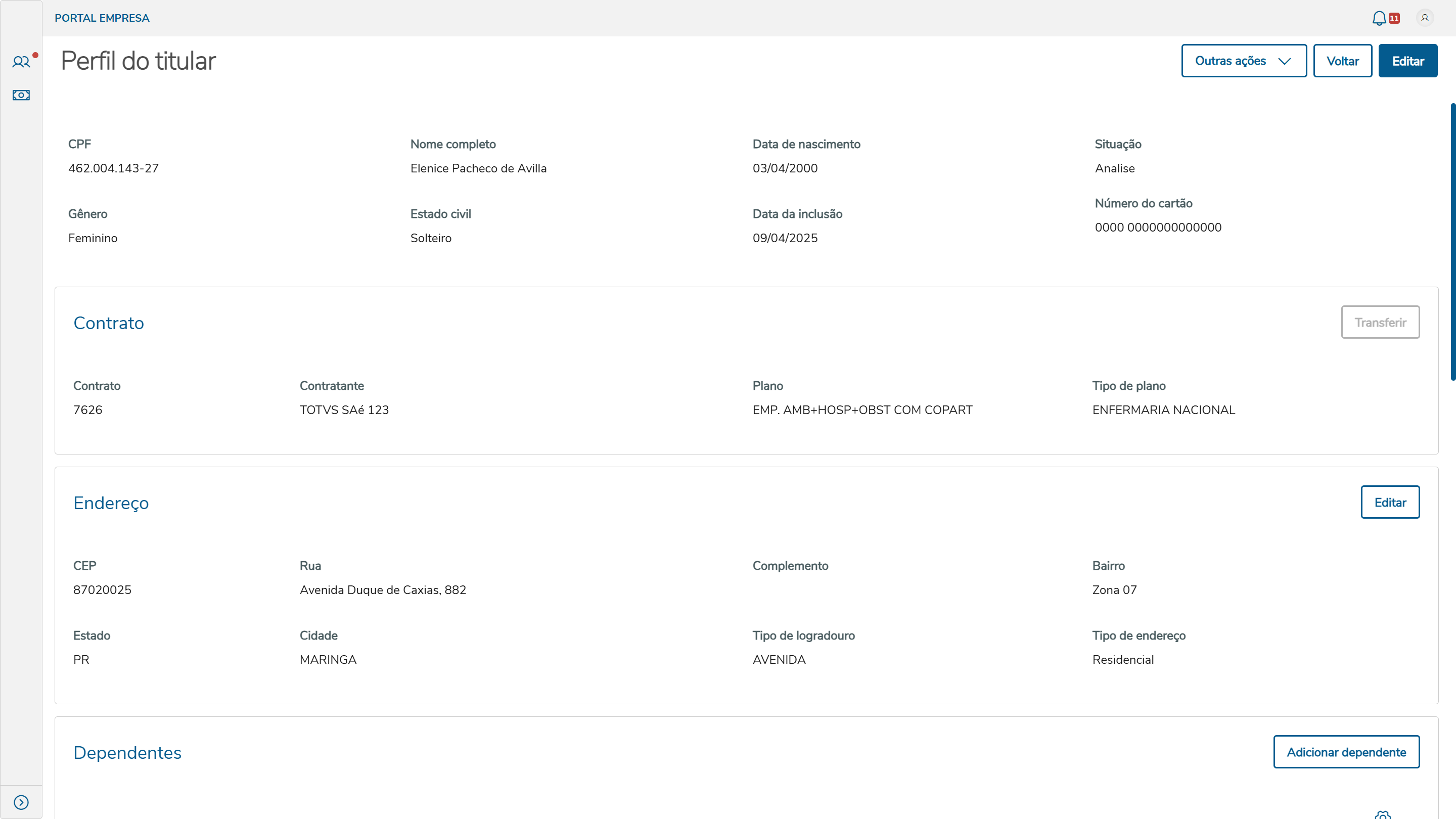 | Detalhar | Detalha os dados cadastrados para o beneficiário selecionado. Cada seção contém um botão de ação, pertinente a seção em si, podendo ser "Editar", que levará diretamente ao cadastro do beneficiário, na seção selecionada, "Adicionar Dependente" ou "Transferir". Com exceção da seção de Anexos, cuja edição é realizada através de uma tela específica. Caso o titular tenha sido removido por motivo DEMAP, será apresentada a seção Demitido e Aposentado, e caso este titular tenha optado em manter o plano e tenha dependentes, no momento da remoção foi realizada a pergunta de quais dependentes queria manter no plano, então essa lista também está disposta na tabela Dependentes removidos junto do titular. Outras Ações/Ações Relacionadas: