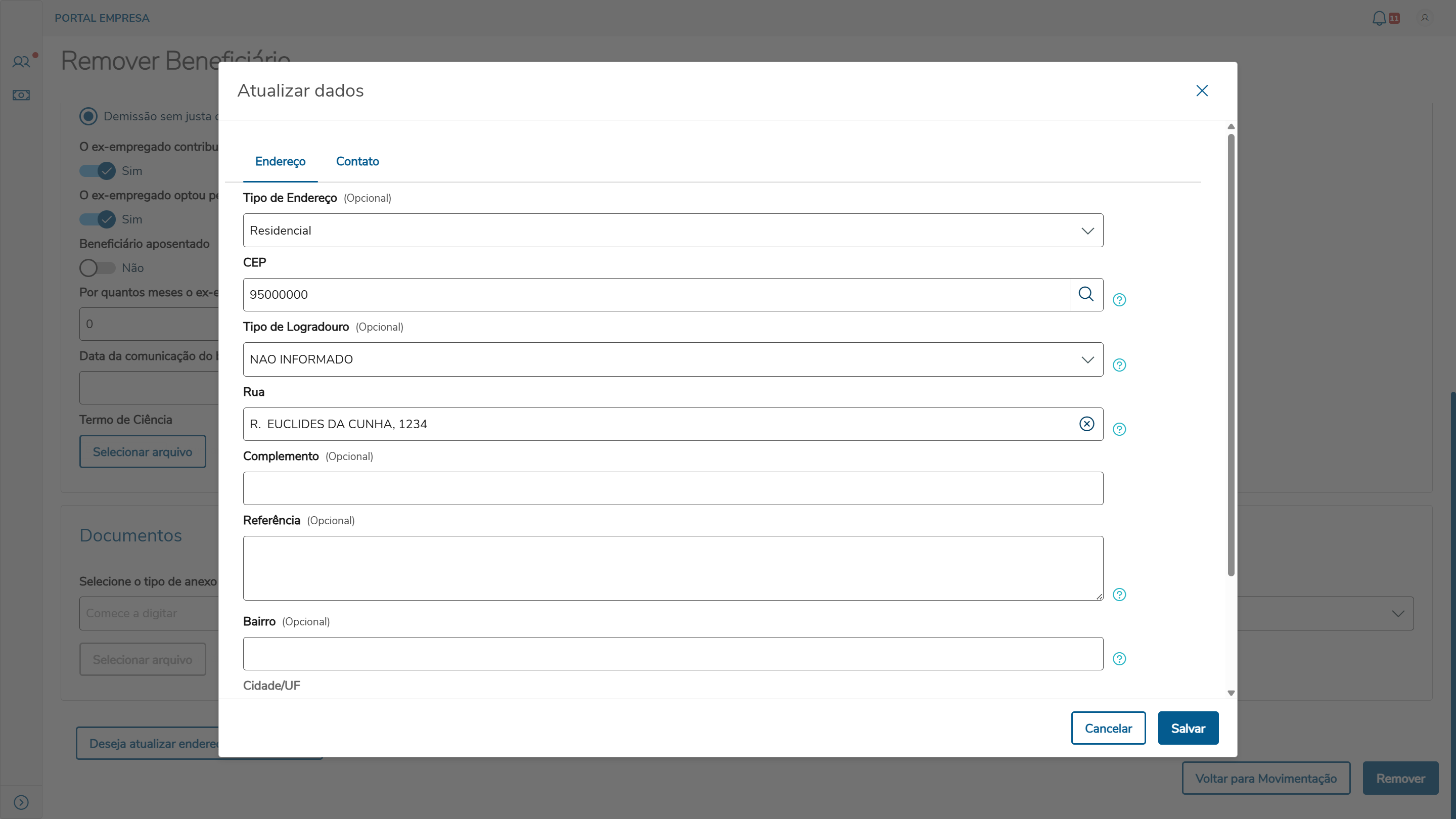 | Remover | Essa função permite remover beneficiários dos contratos. Pode-se remover beneficiários em lote, o qual irá aparecer "1 de 3", por exemplo, se selecionado 3 beneficiários ativos para remoção. Deve-se selecionar o beneficiário que se deseja excluir, informar a data de exclusão e o motivo. Esse processo permite ainda que sejam anexados documentos à tarefa de exclusão de beneficiários. OBS.: Caso esteja parametrizado para análise, o beneficiário excluído ficará Pendente de Exclusão, permanecendo ativo até que a análise seja efetuada. Caso motivo de remoção do beneficiário seja referente a óbito, será necessário informar a data de óbito do beneficiário. Caso o beneficiário selecionado seja um titular e o mesmo possuir dependentes, será apresentado um campo para seleção do Motivo de Remoção para os dependentes. OBS: Este motivo de remoção será utilizado para todos os dependentes. E quando o motivo de remoção estiver parametrizado já no programa Motivo de Cancelamento Genérico, irá bloquear a alteração do campo: Caso o motivo de cancelamento seja de DEMAP, conforme indicador no programa Manutenção Motivos Cancelamento Genérico, será possível responder o questionário e seguir o processo de Demitidos e Aposentados. A opção "Termo de Ciência" permite realizar o upload do arquivo de termo de ciência nas ações na tela de manutenção de beneficiários. Quando o motivo da remoção for DEMAP, o titular possuir dependentes e optar por permanecer no plano, será carregada uma tabela com os dependentes ativos para que sejam selecionados aqueles que desejam manter o plano. Após a conclusão da remoção do beneficiário, essas informações poderão ser consultadas pela tela de detalhes do beneficiário titular. Deseja atualizar endereço e/ou contatos? Ao clicar nesse link (que está ao final da pagina de remoção do beneficiário), será aberta a tela seguir que possibilita realizar a atualização dos dados de contato e endereço do beneficiário que está sendo removido. Isso é importante para que caso o beneficiário seja incluído em outro plano essas informações já fiquem corretas, ou mesmo para possíveis futuros contatos da operadora. | ||||||||||||||||||||||