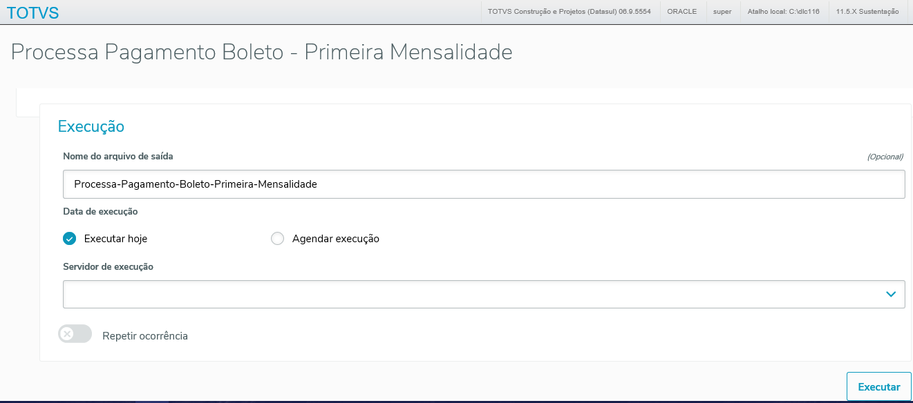 | Servidor de Execução: | Informar o servidor de execução de RPW, parametrizado pelo cliente. |