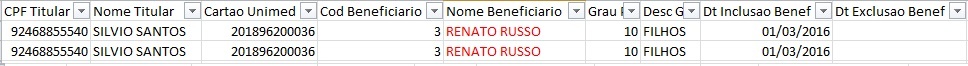 Nas próximas colunas temos os dados do "Beneficiário", sendo que os dois movimentos foram incluídos para o mesmo beneficiário.