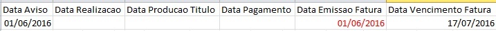 Nas próximas colunas temos as datas. Podemos verificar que a "Data de Emissão" dessa fatura é do dia 01/06/2016:
