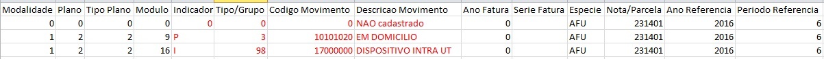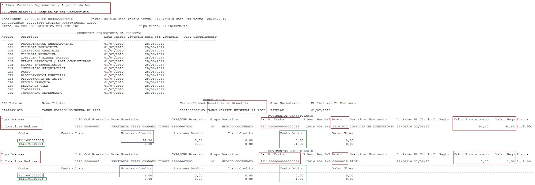 Nas primeiras colunas temos o "Tipo de Contratação", "Segmento Assistencial" e "Tipo de Despesa" do movimento. Nesse exemplo temos dois movimento com "Tipo de Contratação: 6", "Segmento: 6" e "Tipo de Despesa: 1.Consulta Médica".