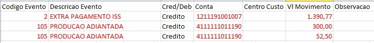 Nas próximas colunas temos o "Código do Evento" extra, a "Conta" e o "Valor" do evento.