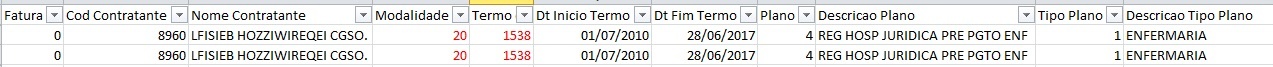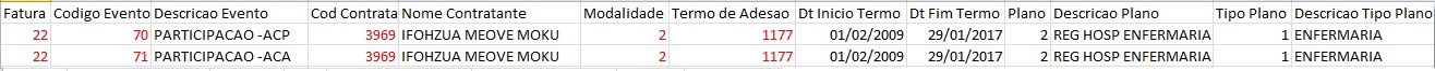 Nas próximas colunas temos os dados referente ao "Plano". Podemos verificar também que esses registros pertencem a fatura 22 do contratante "3969", e que a fatura possui dois eventos.