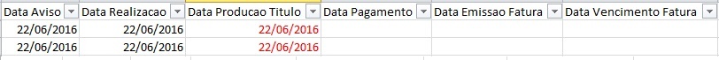Nas próximas colunas temos as datas desses movimentos. Podemos verificar a "Data de Produção do Título" é do dia 22/06/2016.