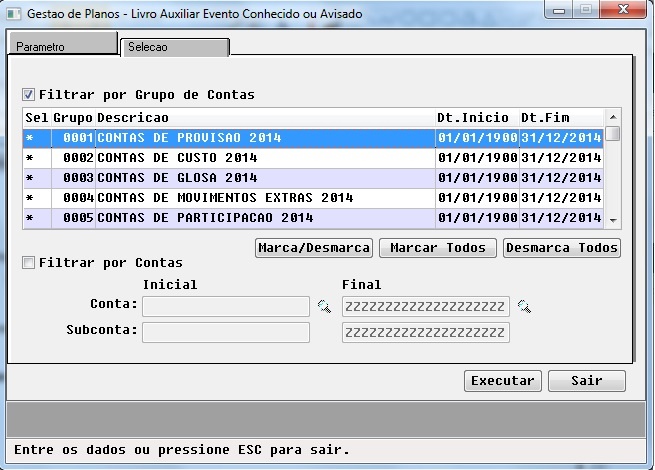 • Subconta Inicial e Final: Campo somente para visualização com as subcontas "Inicial" e "Final", de acordo com as contas informadas pelo usuário no campo "Conta".