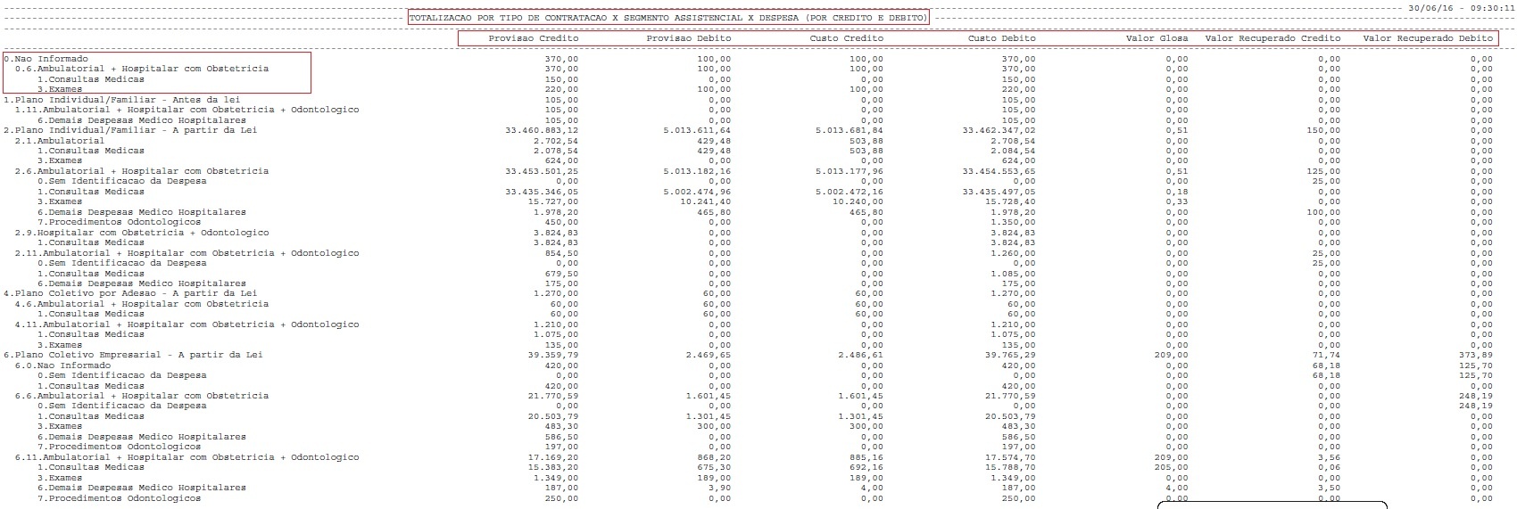 Nas primeiras colunas temos o "Tipo de Contratação", "Segmento Assistencial" e "Tipo de Despesa" do movimento. Nesse exemplo temos dois movimento com "Tipo de Contratação:  2", "Segmento: 6" e "Tipo de despesa: 1.Consulta Médica e 6. Demais Despesas".