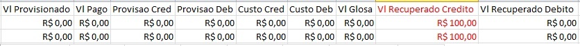 Nas próximas colunas temos os valores da fatura. Nesse caso temos o "Valor Recuperado de Crédito" para os movimentos da fatura: