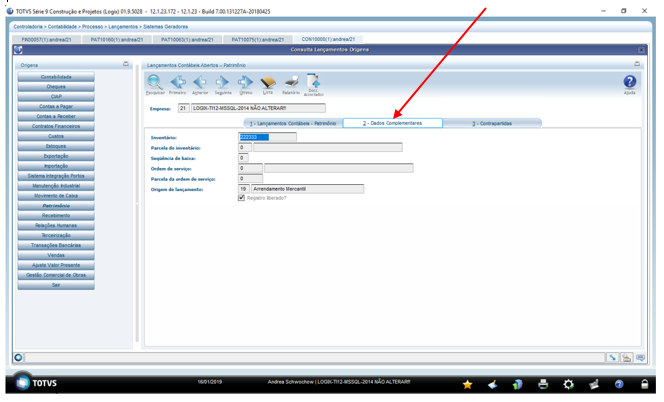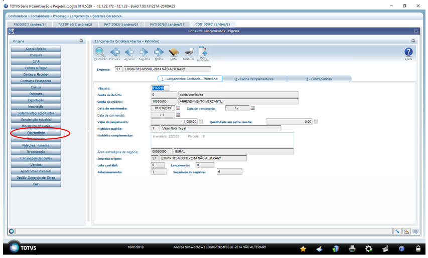 O CON10000 foi alterado para que, na opção “Patrimônio”, passe a apresentar os lançamentos contábeis relacionados aos contratos de arrendamento mercantil (origem lançamento = 19):