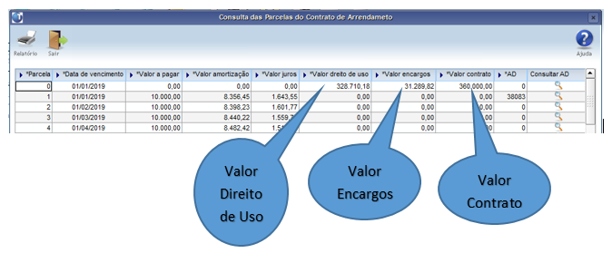 Os valores de Direito de Uso, Encargos e valor do Contrato aparecem na linha identificada como "Parcela 0":