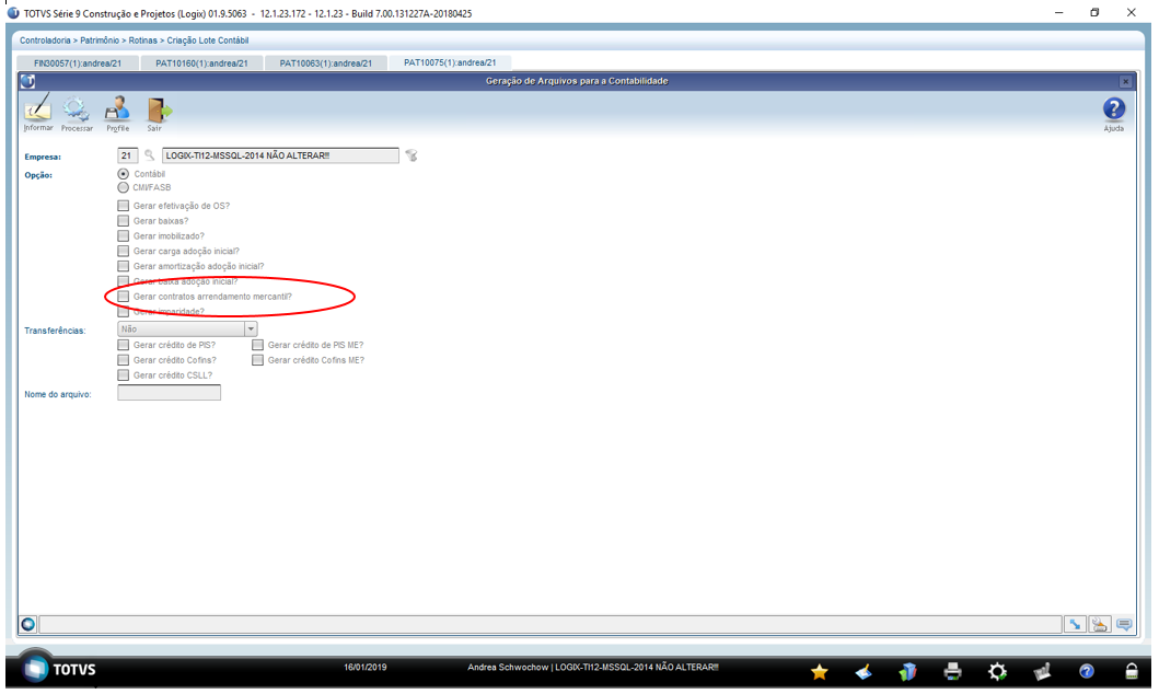 O PAT10075 foi alterado, sendo criada a opção “Gerar contratos arrendamento mercantil?”.