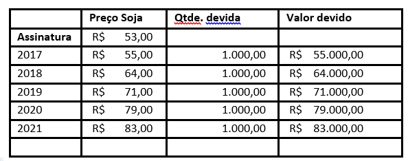 Exemplo: contrato com data de assinatura em 01/01/2017, com valor de locação anual de 1000 sacas de soja, e prazo de pagamento no início de cada ano. Contrato de 5 anos, sendo que cada ano terá um preço de soja diferenciado: