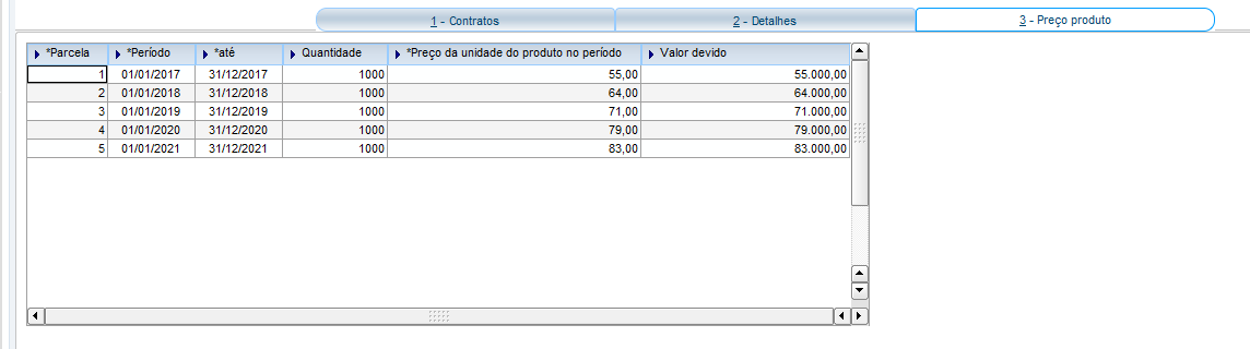 Na aba “3 - Preço produto”, será informado o período de vigência de cada parcela, a quantidade de produtos a ser paga em cada parcela, e o preço da unidade do produto no período.
