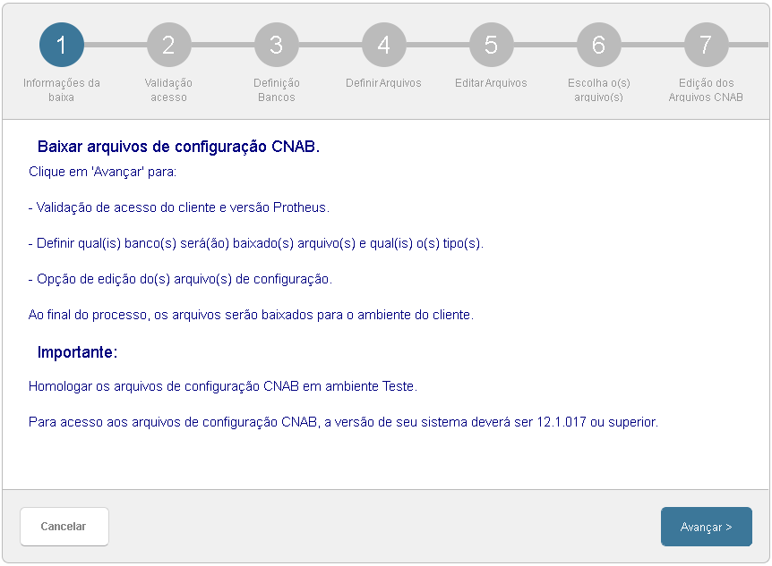 • El cliente no tendrá acceso a los archivos de configuración CNAB si la Release fuera inferior a 12.1.20 o cualquier otro release futuro que fuera necesario incremento de diccionario publicado vía release notes.