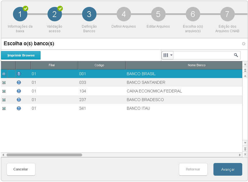 • Los bancos listados se buscarán en la base de datos del cliente por medio de la tabla SA6. Los bancos que estuvieran bloqueados para uso no se mostrarán en esta pantalla.
