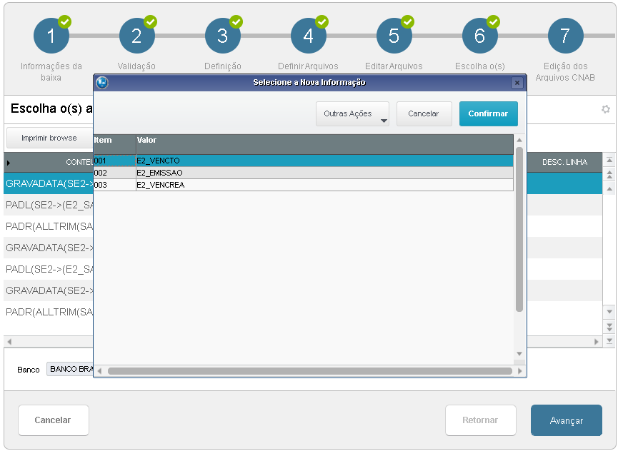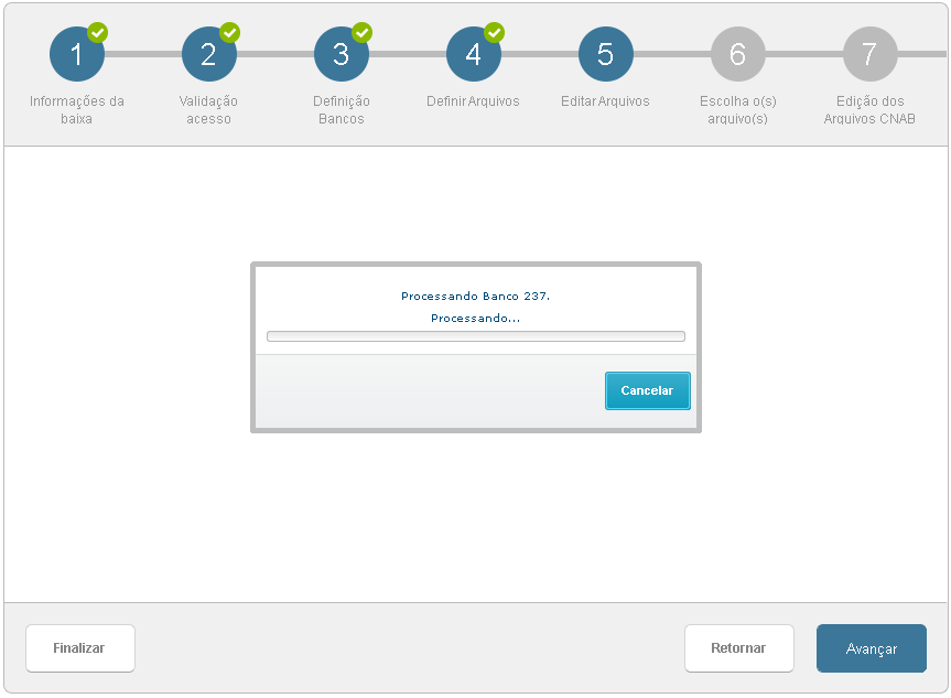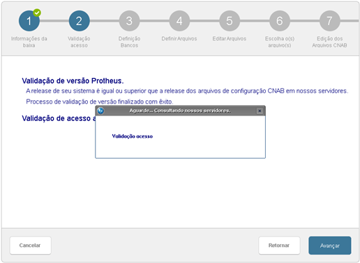 En este paso se iniciará el proceso de download de los archivos de configuración CNAB. El sistema grabará las informaciones de los archivos de configuración en las tablas FOP, FOQ y FOZ.