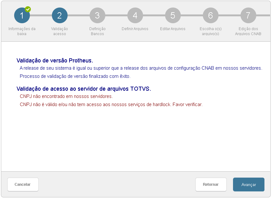 • El cliente no tendrá acceso a los archivos de configuración CNAB si el RCPJ del cliente no tuviera acceso a los servicios de hard lock de TOTVS vía Cloud o que tenga cualquier restricción contractual que efectúe su bloqueo.