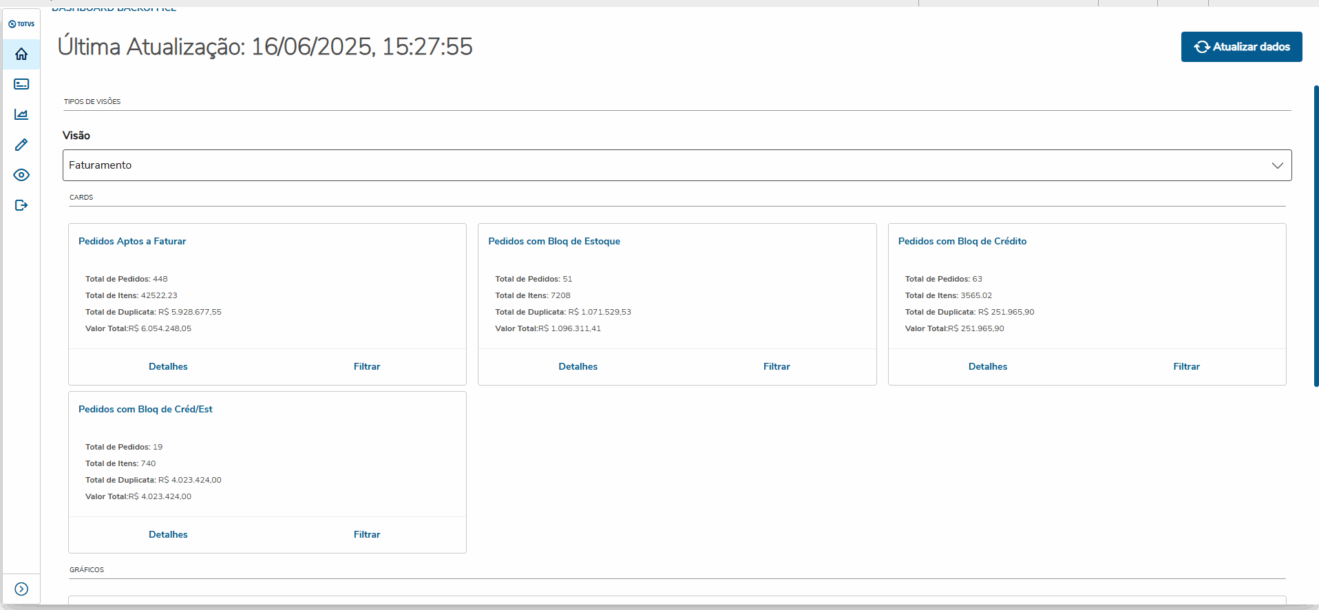2) Después de seleccionar la visión deseada, el Analysis Dashboard mostrará los cards y gráficos registrados en la visión correspondiente: