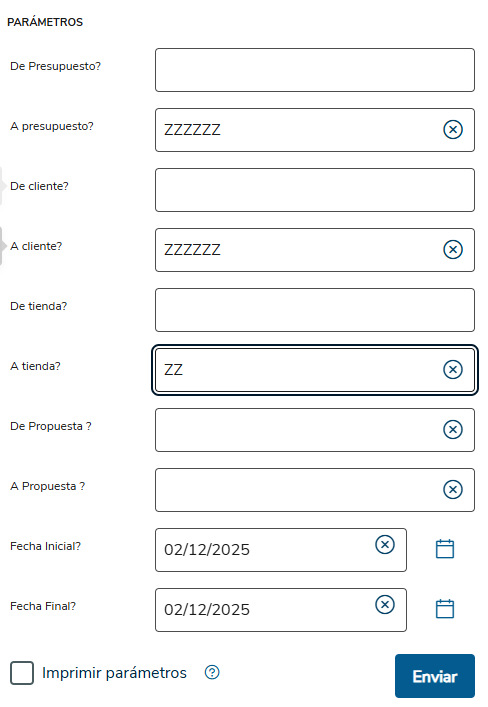 ¿De Presupuestos? | Informe el número del presupuesto inicial para filtrar los datos |