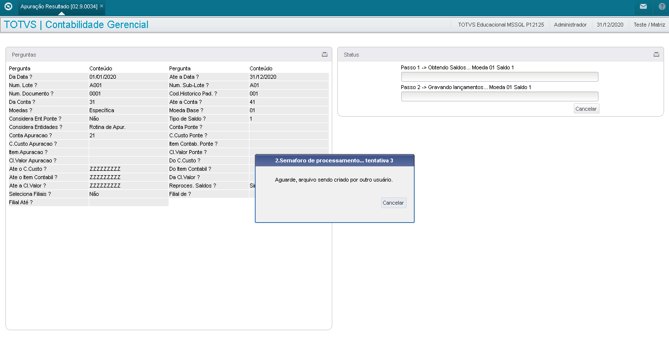 The Calculation of Results routine depends on and must be executed in exclusive mode, in order to inhibit the interpretation of inconsistencies in its execution.