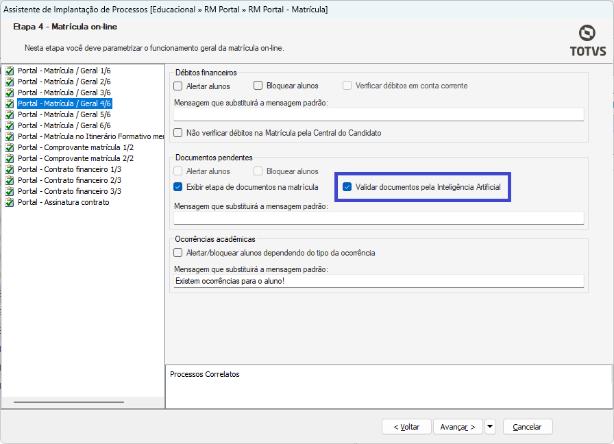 Para que o documento seja validado automaticamente por inteligência artificial durante a etapa de envio de documentos na matrícula online, é necessário, além de habilitar a opção de validação por IA no cadastro do documento exigido, ativar também o parâmetro correspondente no sistema. Essa configuração pode ser feita acessando: Parâmetros > RM Portal Matrícula > Portal - Matrícula / Geral 4/6.