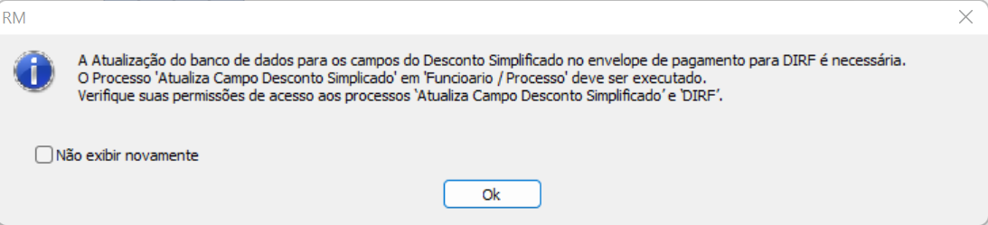 Essa mensagem será apresentada para quem tem acesso ao processo Atualiza Campos Desconto Simplificado e DIRF e enquanto existirem campos na base diferentes de 2 - Não usou o simplificado ou 3 - Usou o simplificado que estejam dentro de uma verificação interna para serem enviados para a geração da DIRF.