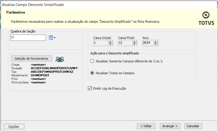 | Emitir Log de Execução | Parâmetro para gerar ou não o log de execução. |
