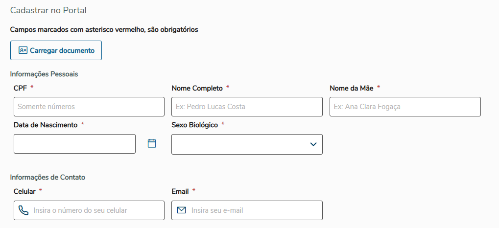 O botão Carregar documento permite ao usuário enviar fotos de documentos para extrair com o uso de IA informações como CPF, Nome, Nome da mãe, Sexo e data de nascimento de documentos como Identidade ou CNH.