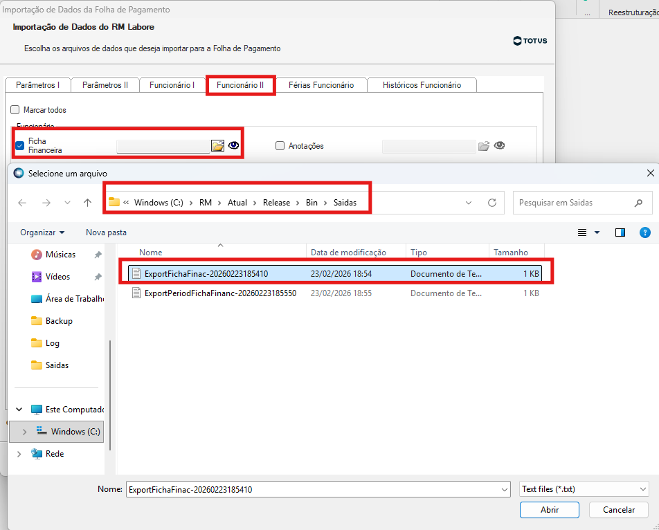 • Selecionar o arquivo do período da ficha financeira gerado anteriormente