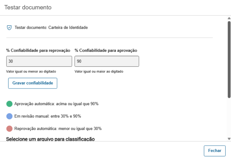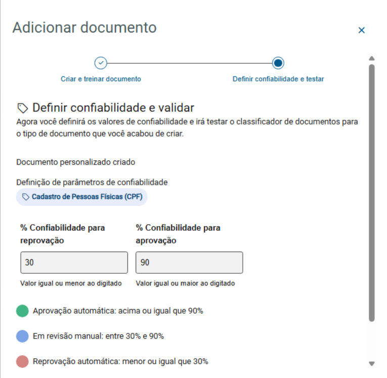 Após selecionar o documento, defina o nível mínimo de confiança exigido para aprovação automática: