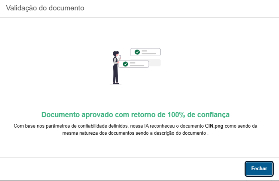 Também é possível testar um documento: basta incluí-lo no sistema, que realizará a validação automaticamente, apresentando um dos três tipos de retorno descritos abaixo: