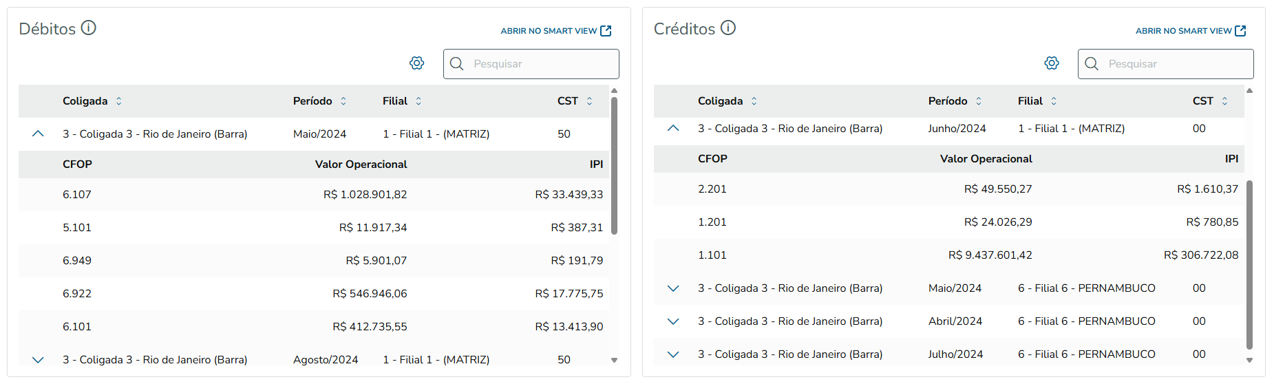 Estas grids mostram os detalhamentos dos créditos e dos débitos do IPI, totalizando os valores do tributo por Coligada, período, Filial, CST e CFOP.