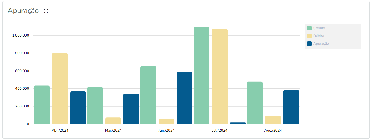 Este quadro traz a representação gráfica do total dos créditos, dos débitos e o saldo do imposto a pagar ou o saldo credor por período de apuração.