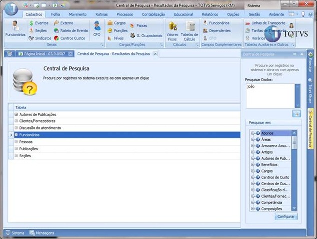 | | Introdução A central de pesquisa é um novo recurso desenvolvido pela TOTVS, que possibilita aos usuários da nova MDI a buscarem dentro do sistema informações de várias tabelas em uma só pesquisa. |