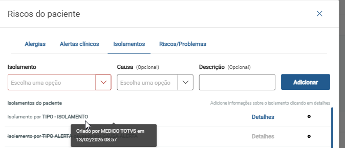 Ao clicar em adicionar o registro será adicionado à listagem de isolamentos do paciente