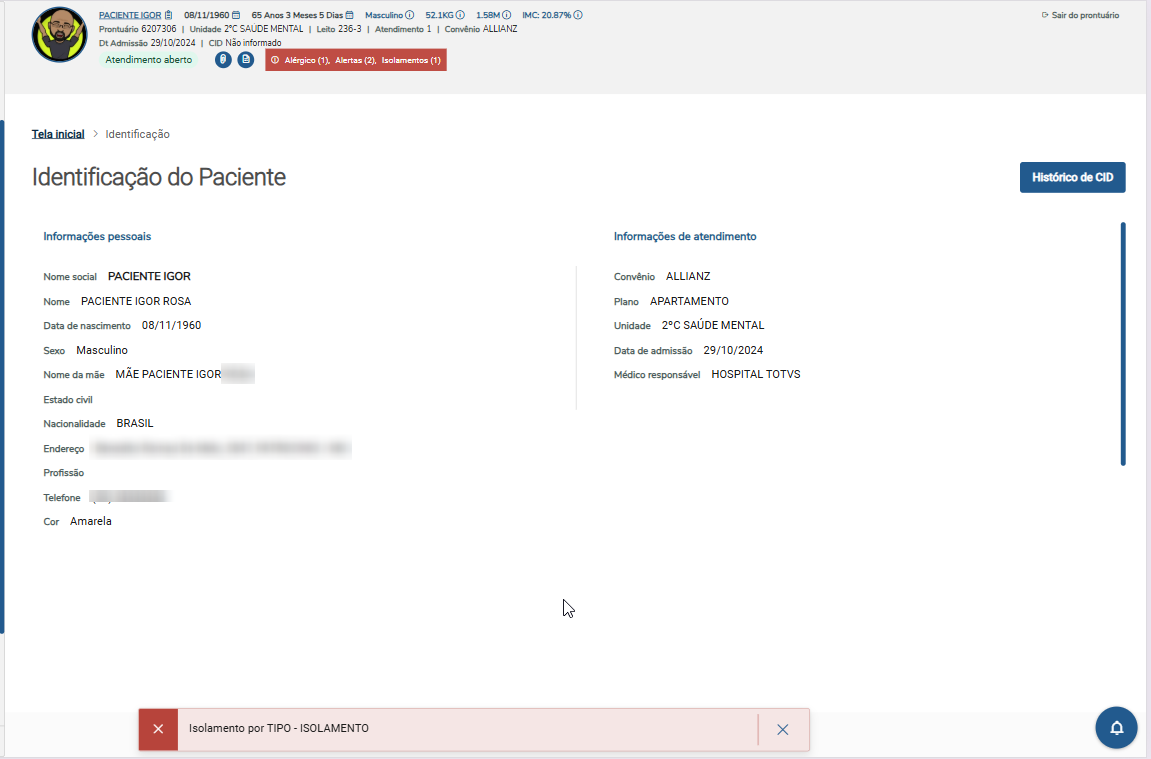 Ao abrir o prontuário uma mensagem é exibida para com a descrição do isolamento do paciente.