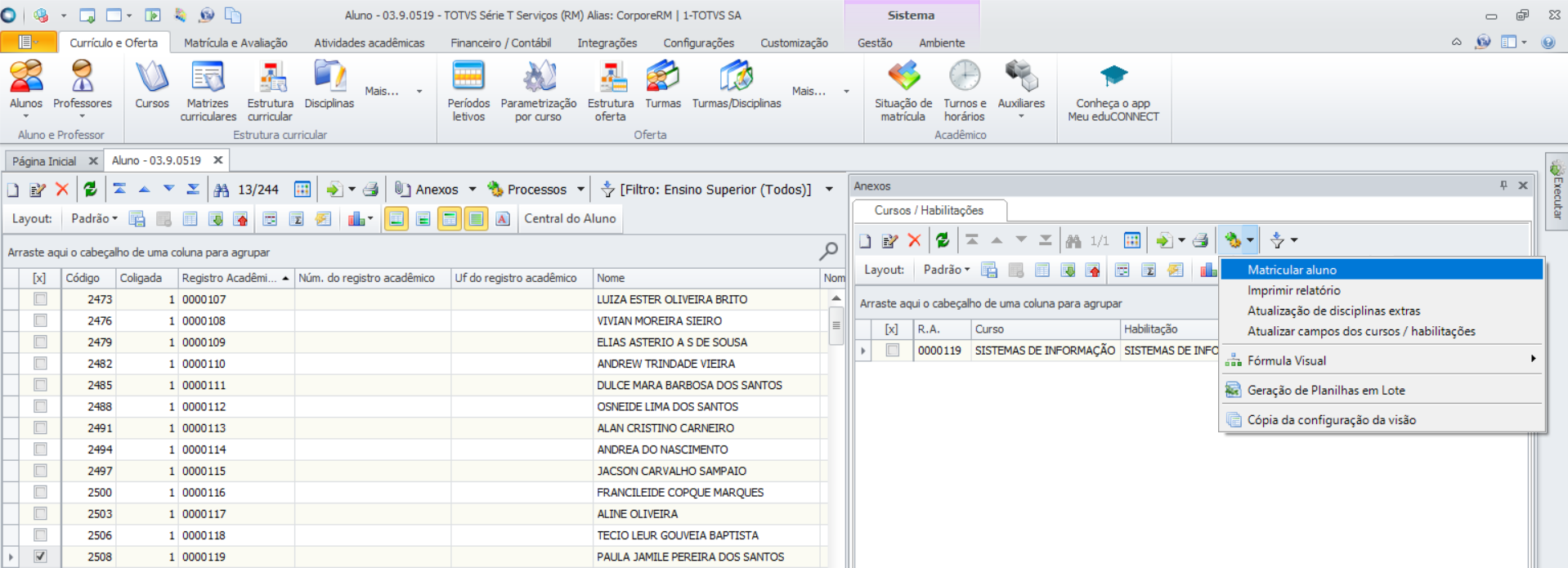 Para realizar a matrícula do aluno do Ensino Superior primeiro é necessário cadastrar um curso e habilitação para ele em Aluno | Anexo | Curso/Habilitação. Após realizar esse cadastro, deve-se executar o processo de matrícula disponível em Curso/Habilitação | Processos | Matricular Aluno: