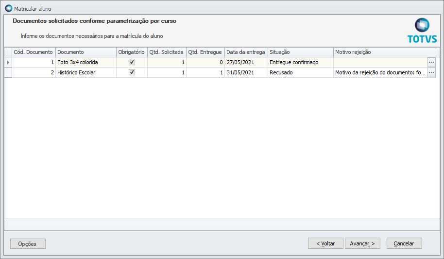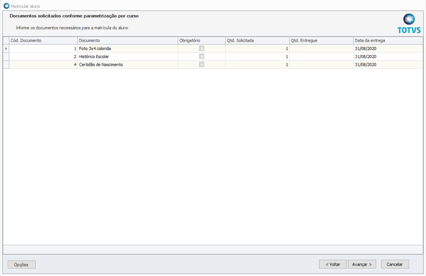 Para habilitar esse passo no processo de matrícula é necessário marcar o parâmetro Educacional Matrícula | Movimento 1/3 | Informar documentos obrigatórios entregues. Os documentos configurados na parametrização do curso, TOTVS Educacional | Currículo e Oferta | Oferta | Parametrização por curso | Anexos | Documentos Exigidos, serão apresentados nessa tela onde o usuário irá marcar a quantidade entregue e a data de entrega.