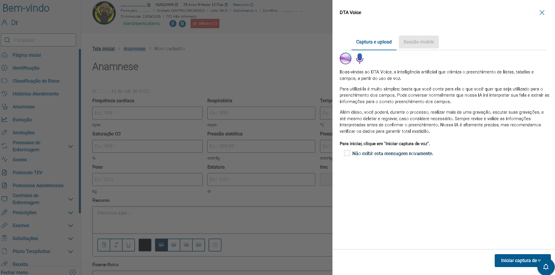 O DTA permite preencher o formulário de anamnese por comandos de voz, convertendo a fala em texto automaticamente.