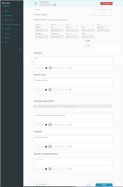 - Ao entrar na anamnese os campos apareceram desbloqueados, sendo possível incluir os dados, executar a ação de voltar, usar modelo, excluir rascunho, salvar um modelo, finalizar a anamnese ou finalizar e imprimir a anamnese.