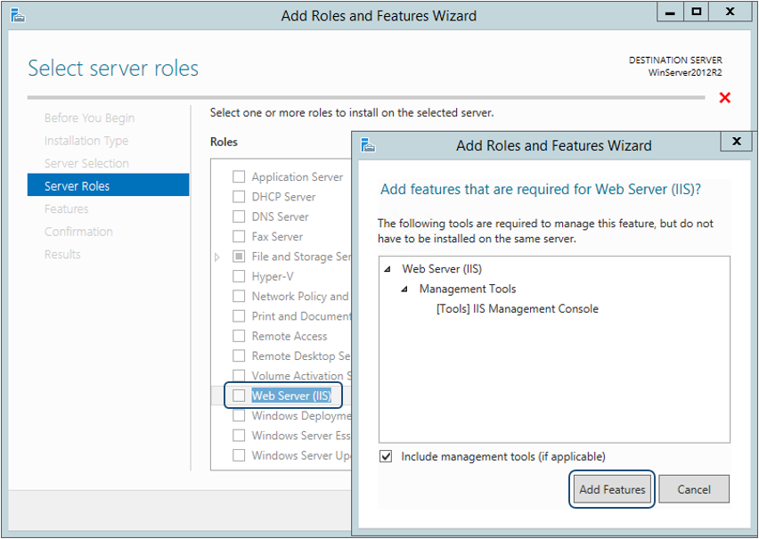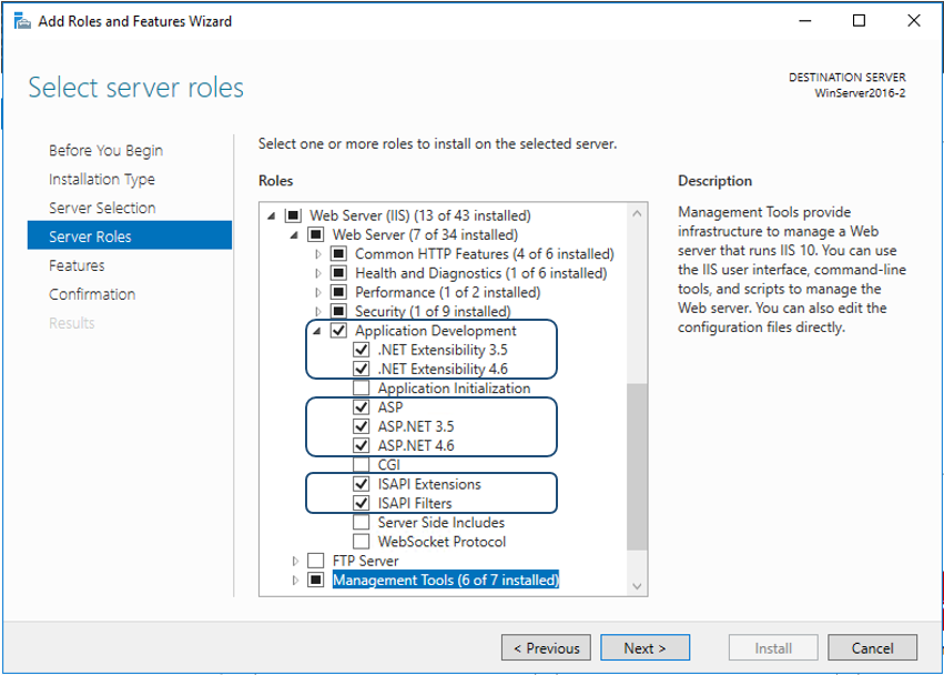 Na versão 8.0 do IIS acesse o Gerenciador do Servidor | Adicionar Funções e Recursos e ative as seguintes configurações.
