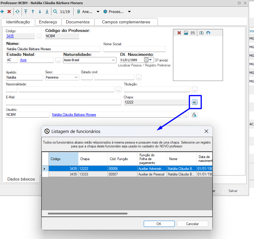 O botão Trocar a chapa só estará habilitado se o professor for funcionário que exerce função de professor e tiver mais de uma chapa, entretanto a troca de chapa somente será possível o mesmo Professor possuir dois registros de Funcionários associados a mesma Pessoa com chapas diferentes e que as funções esteja associadas as Funções de professores, caso atenda as estas regras, ao clicar no botão será aberta uma janela que o usuário poderá trocar a chapa do Professor, conforme abaixo.