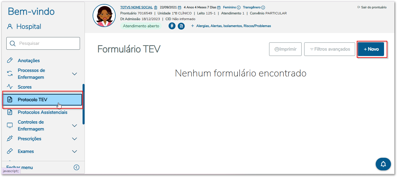 O Protocolo TEV tem como finalidade apoiar a avaliação do risco de tromboembolismo venoso e orientar a aplicação de medidas preventivas, conforme o perfil clínico do paciente. A funcionalidade permite padronizar processos, apoiar a decisão clínica e promover a segurança do paciente, em conformidade com diretrizes institucionais e regulatórias.