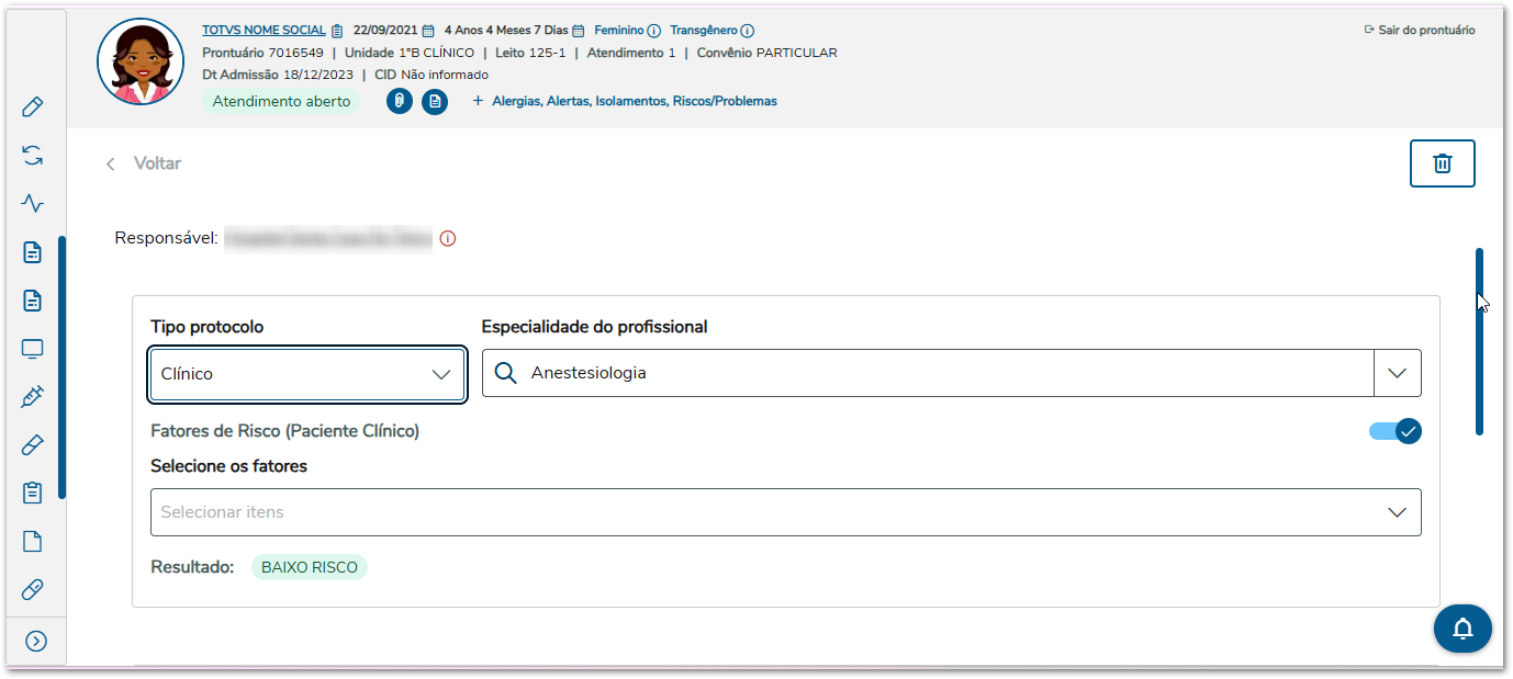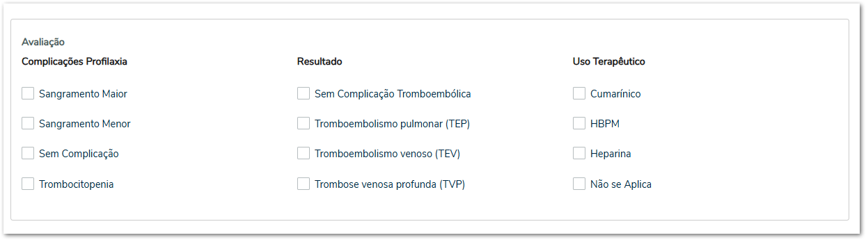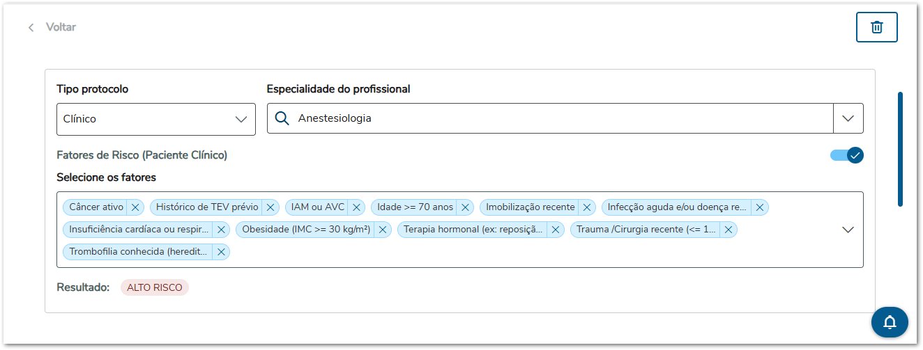 À medida que os fatores são selecionados, o sistema realiza automaticamente o cálculo e apresenta o resultado da avaliação, indicando o nível de risco de TEV (por exemplo, Baixo Risco). Esse resultado auxilia o profissional na tomada de decisão clínica e na definição das medidas preventivas adequadas.